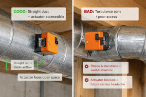 A good damper install is one where the damper sits in predictable airflow and the actuator is positioned so your hands and a meter can actually get to it.