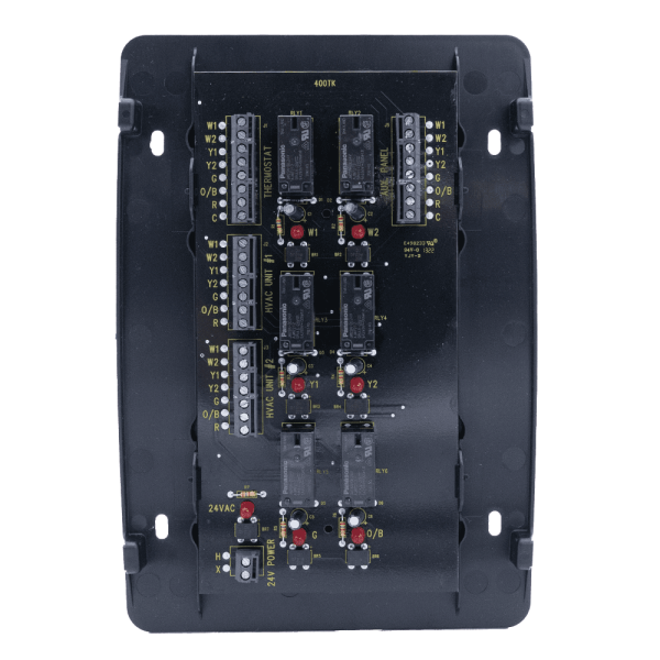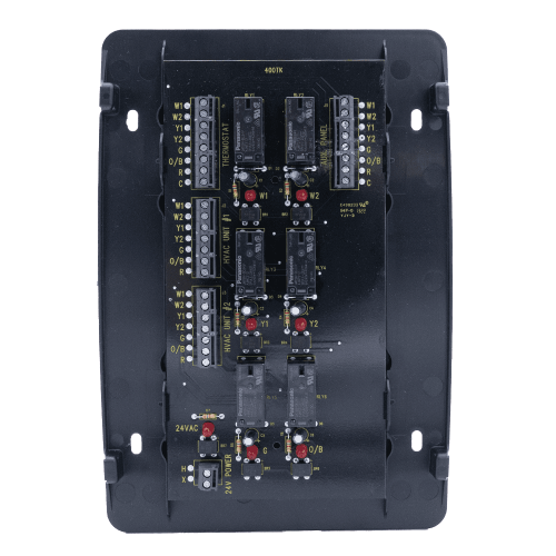 The Twinning Zone Panel is designed to allow a single thermostat to control two identical HVAC units. It can also be expanded to control 4 identical HVAC units with one thermostat. The iO-TWIN can be used on common or separate ducted systems with single-stage, multi-stage or heat pump equipment. Uses standard 18-gauge thermostat wire.