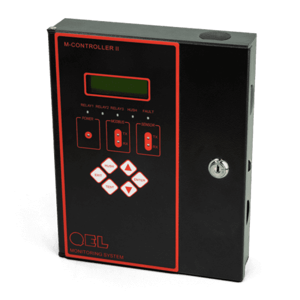 The M-Controller 2 is a multi-channel controller utilizes both digital and analog communications to interface with a maximum of thirty-two (32) remote digital transmitter/sensors, and eight (8) analog transmitter/sensors. The three (3) programmable on-board SPDT Form C dry-contact relays can be configured for voting, averaging, relay on/off delay, normally energized/not-normally energized and latching/non-latching for fan control. The M-Controller 2 has four (4) RS-485 ports for sensors, two (2) dedicated terminals for a horn and strobe, and has a RS-485 port for MODBUS RTU or BACnet IP (Optional) protocol which allows a BAS to monitor the gas detection system. The M-Controller 2 can be programmed using the onboard keypad or using the M-View Software and USB programming cable (Included). The optional analog output card has eight 4-20 mA analog outputs can be set up to output the average of multiple sensors, output the highest signal from multiple sensors. The M-Controller 2 can also compare two different gases (CO and NO2) and output the highest from either to gas to modulate a VFD. Each relay module is addressed from 0 to 11 and is defined by a four-position dipswitch and will correspond with relays 4 though 99. The M-Relay module is available with 2, 4, 6, or 8 relays per module. Refer to all applicable Federal, State, Provincial and Local Health and Safety laws and regulations before using these products.