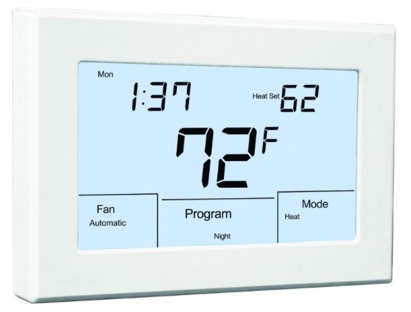 The Z-2000-NS programmable touchscreen thermostat can be used for occupied and unoccupied scheduling of the Z-2000 (Version 2001) panel. When wired and configured properly, the thermostat takes the place of a separate 7-day clock, night stat and override timer. The Z-2000-NS Programmable Fan option is used to trigger the ‘G’ fan relay to open or close the Clock Contact ‘T’ terminals on the Z-2000 (Version 2001) panel that places the system in the occupied or unoccupied mode of operation. The thermostat can also be used with a T-S1 Remote Indoor Wired Sensor. 24 volt power to the thermostat is supplied by the Z-2000 (Version 2001) panel through dedicated Clock Power terminals ‘R’ and ‘C’. The thermostat also has battery backup to maintain the real-time clock in the event of a power failure. The thermostat can be configured to provide 7-day scheduling with 2 or 4 events per day. For commercial schedules, 2 events per day is typical.